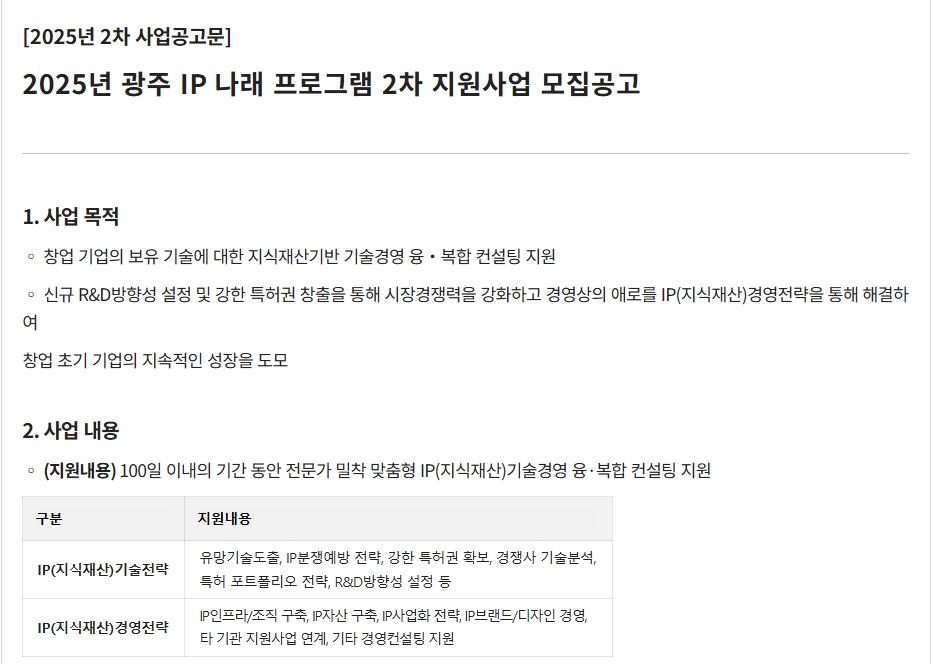 2025년, 광주광역시에서는 중소기업과 예비 창업자를 위한 다양한 정부 지원사업이 활발히 운영되고 있습니다. 특히 'IP나래프로그램'과 '기술개발 지원사업'은 지역 경제 활성화와 기술 경쟁력 강화를 위한 핵심 프로그램으로, 지식재산 기반 창업과 R&D 역량 강화를 원하는 기업들에게 큰 도움이 되고 있습니다.