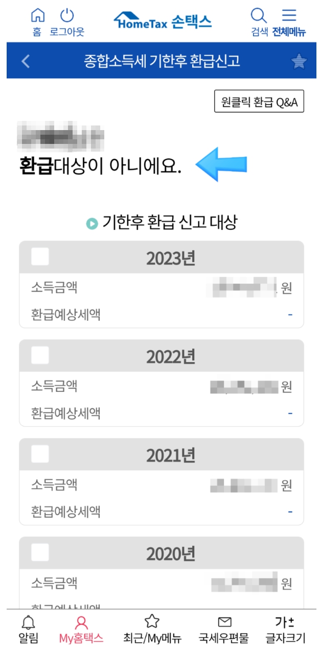 - 홈택스에서 무료로 5년 치 환급금 조회 가능